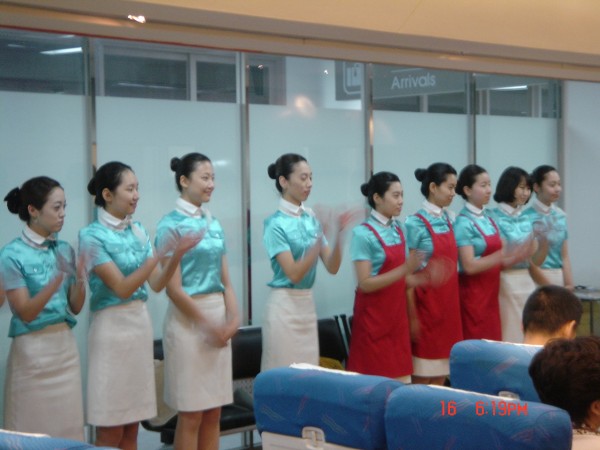 외국인 손님을 상대로 한 기내 탑승 부터 안전장비 설명 그리고 기내방송, 음료서비스를 모두 끝내고 다 함께 박수를 치고 있습니다.