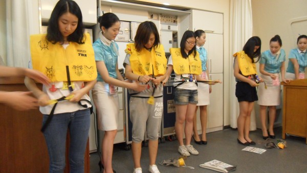 비상시에 사용하는 구명복을 입어보는 실습입니다.