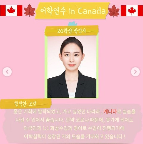 : 좋은 기회에 발탁되었고, 가고 싶었던 나라라, 캐나다로 실습을 나갈 수 있어서 좋습니다. 만약 코로나 때문에 못가게 되어도 외국인과 1:1 화상 수업, 영어로 수업이 진행되기에 어학실력이 성장된 저의 모습을 기대하고 있습니다 !